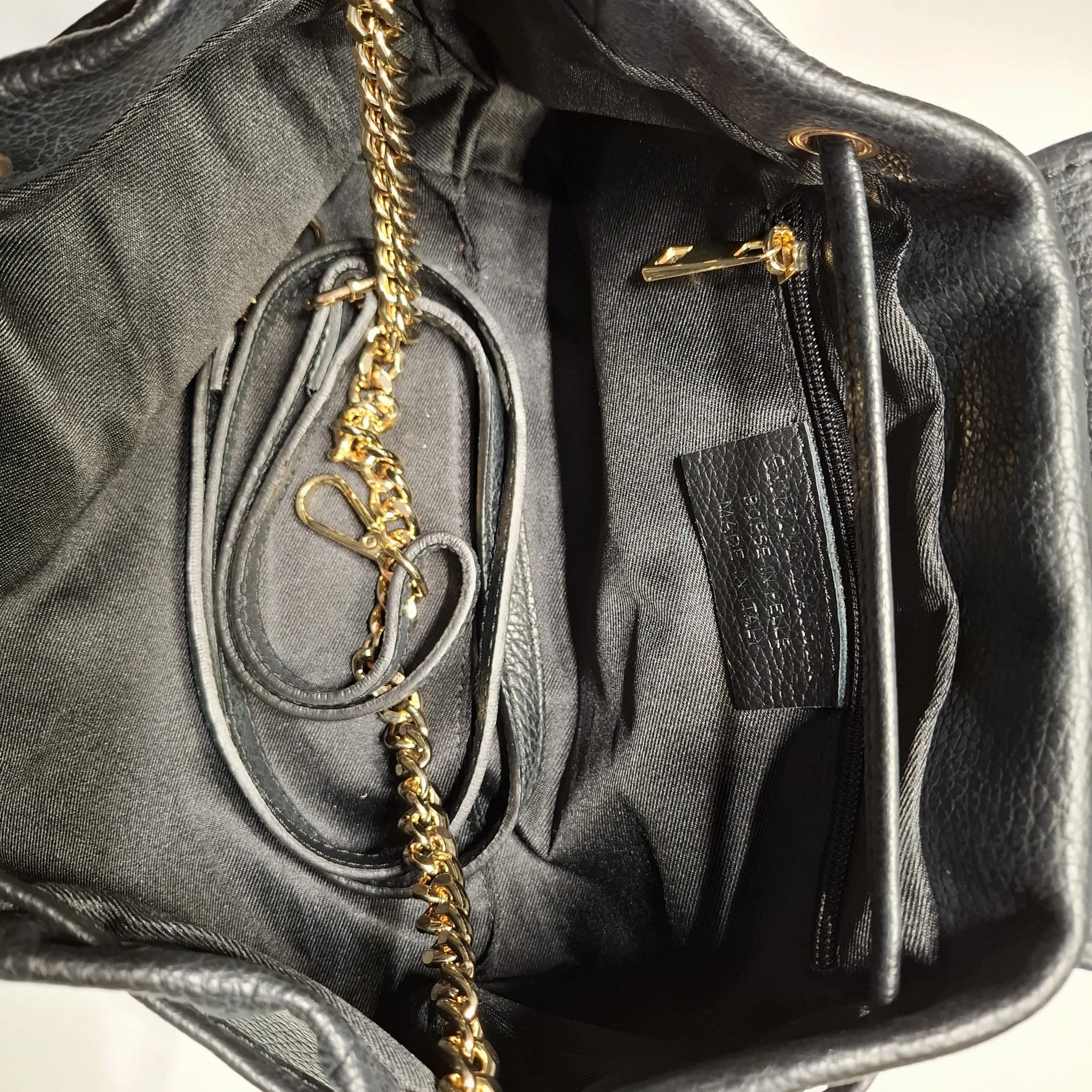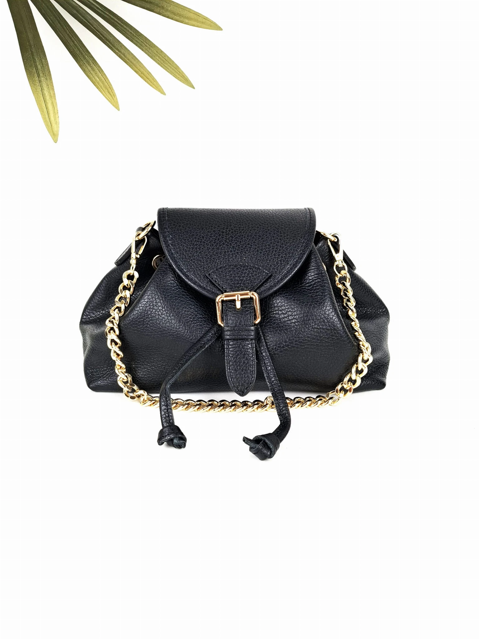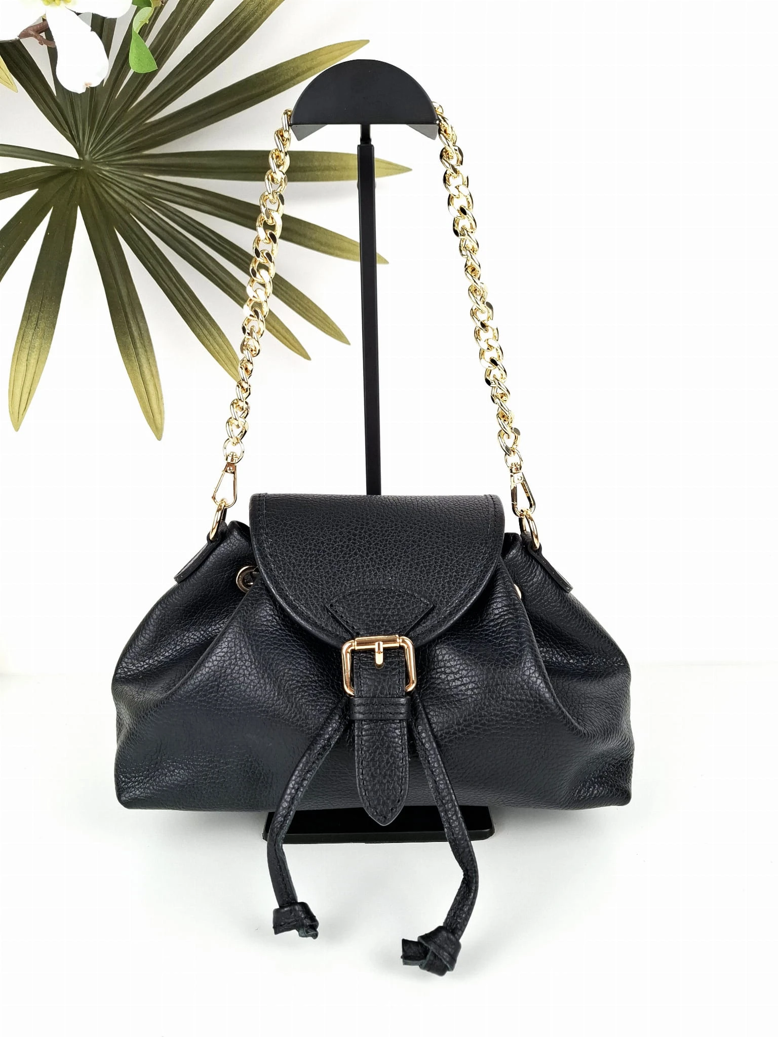 Elegancka torebka damska o unikalnym fasonie, w kolorze głębokiej czerni. Wykonana z wysokiej jakości skóry naturalnej . Złoty, łańcuszkowy pasek dodaje jej szyku, a zapięcie w postaci klapki z klamrą oraz ściągany worek sprawiają , że model ten będzie idealnym uzupełnieniem codziennych jak i bardziej wyszukanych stylizacji .