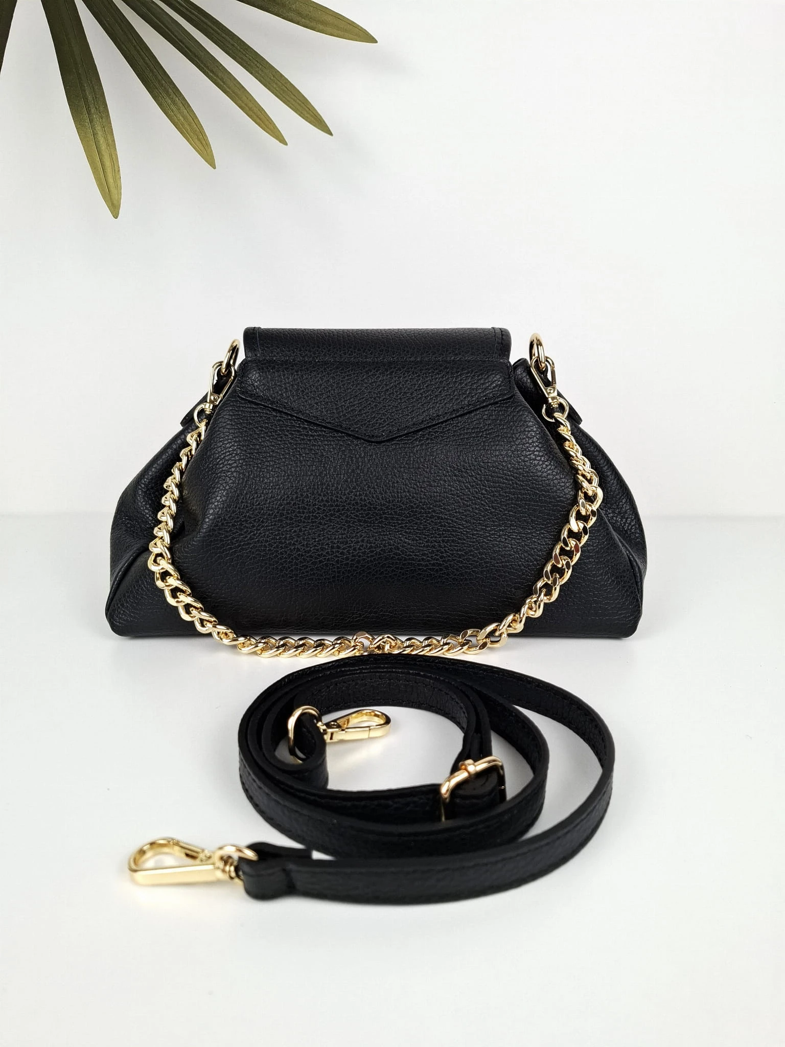 Wykonana z wysokiej jakości skóry naturalnej, torebka zachwyca swoją trwałością i piękną, groszkową fakturą. Głęboka czerń jest uniwersalna i pasuje do każdej stylizacji, od casualowych jeansów po bardziej formalne outfity. Złoty, gruby łańcuszek pełni rolę paska, dodając torebce charakteru i nowoczesnego akcentu.