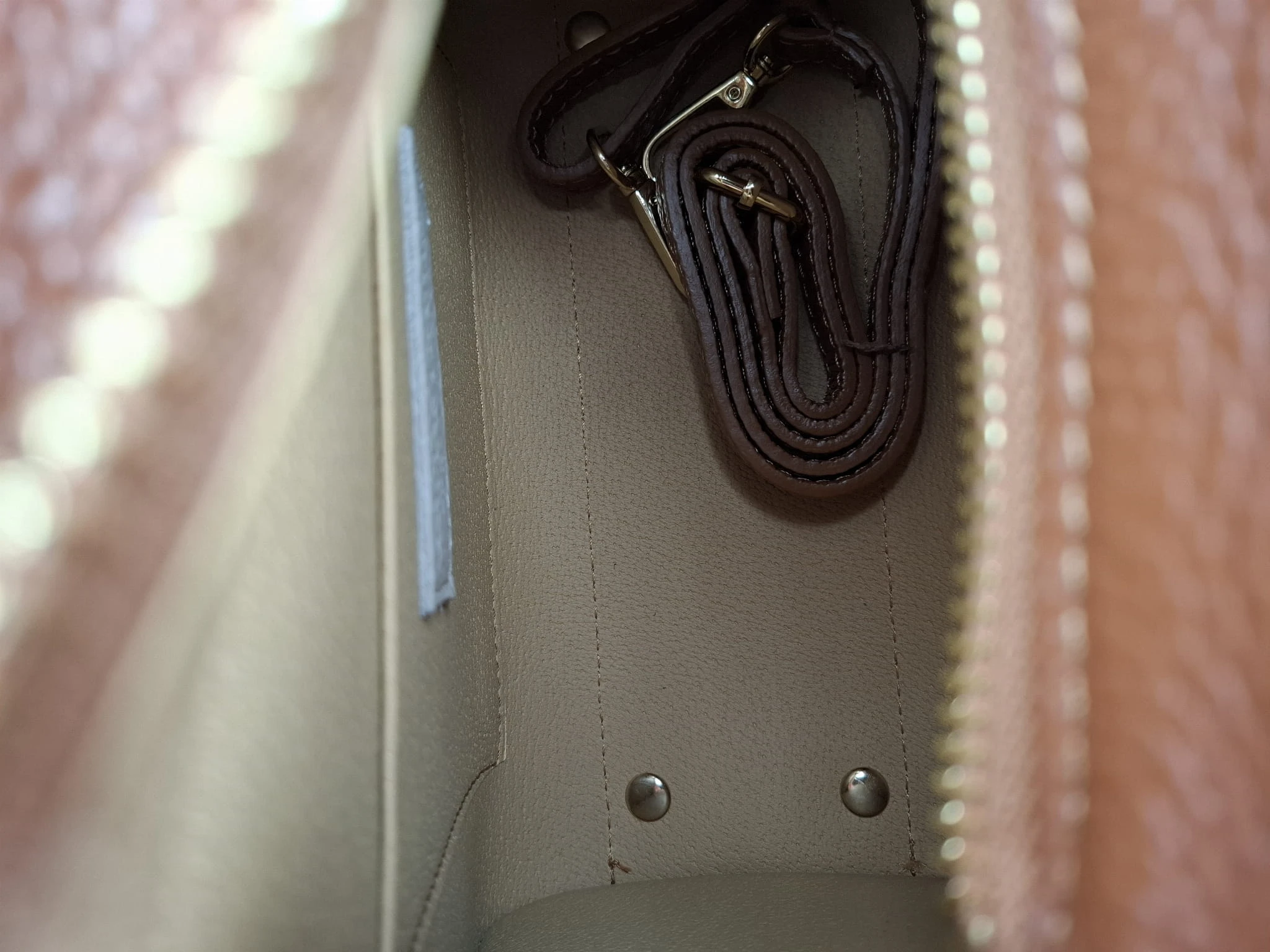 Środek torebki to jedna komora wykończona na surowo tworzywem oraz mała kieszonka na drobiazgi. Całość zamykana na suwak .