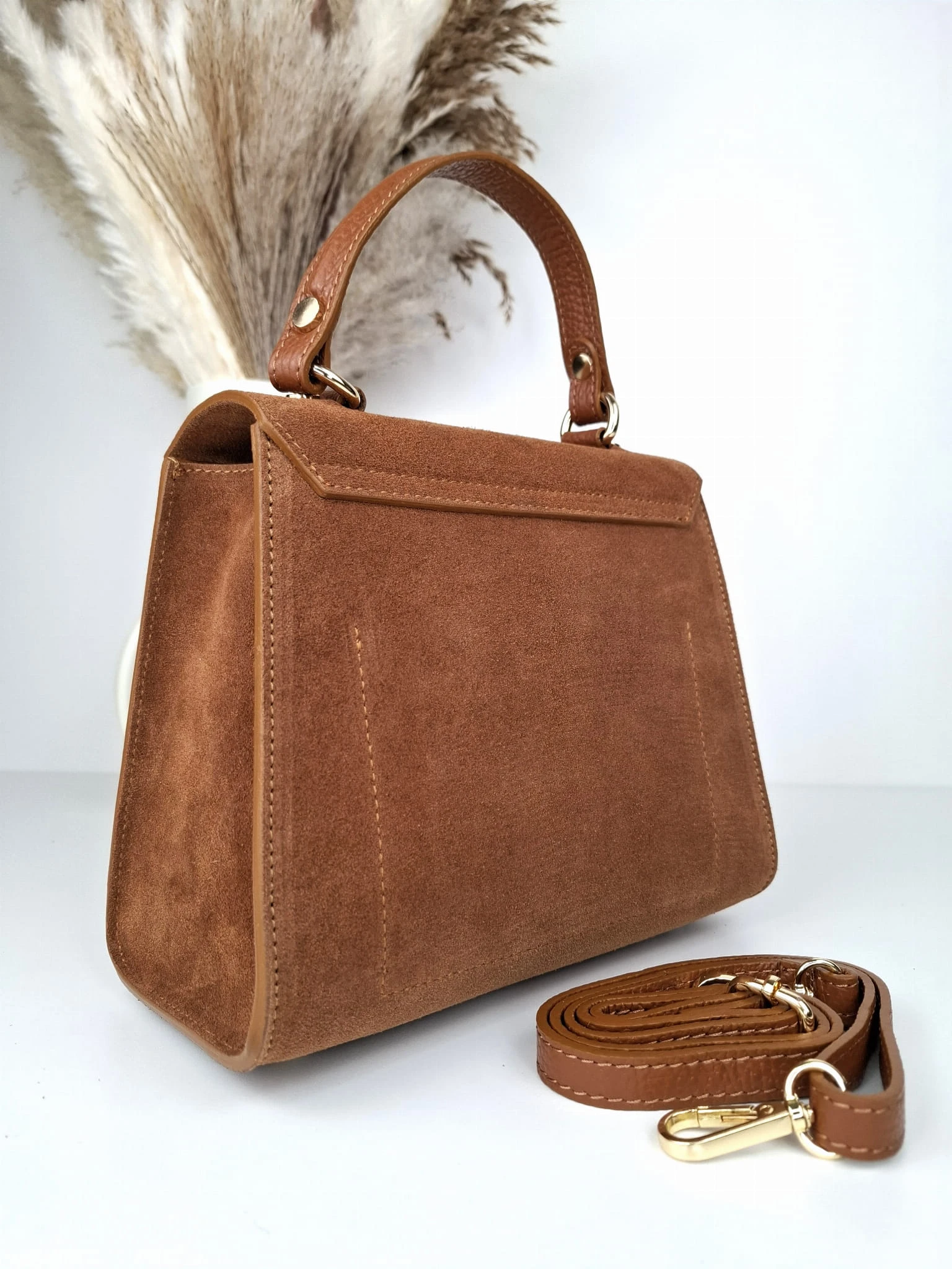 Kuferek wykonany ze skóry naturalnej zamszowej w kolorze brązu camel cuoio.