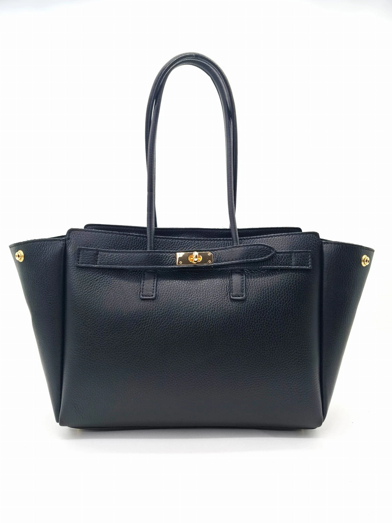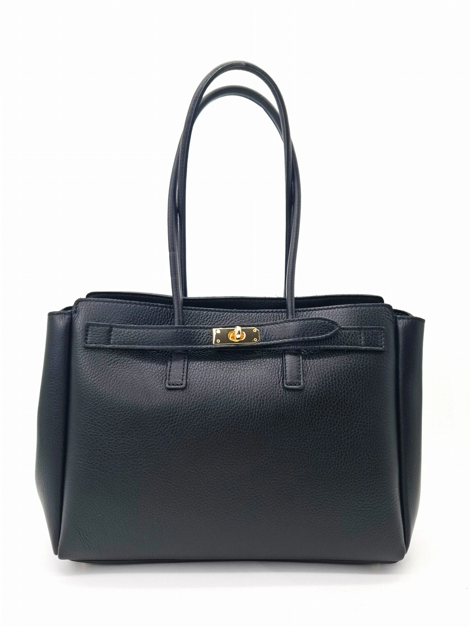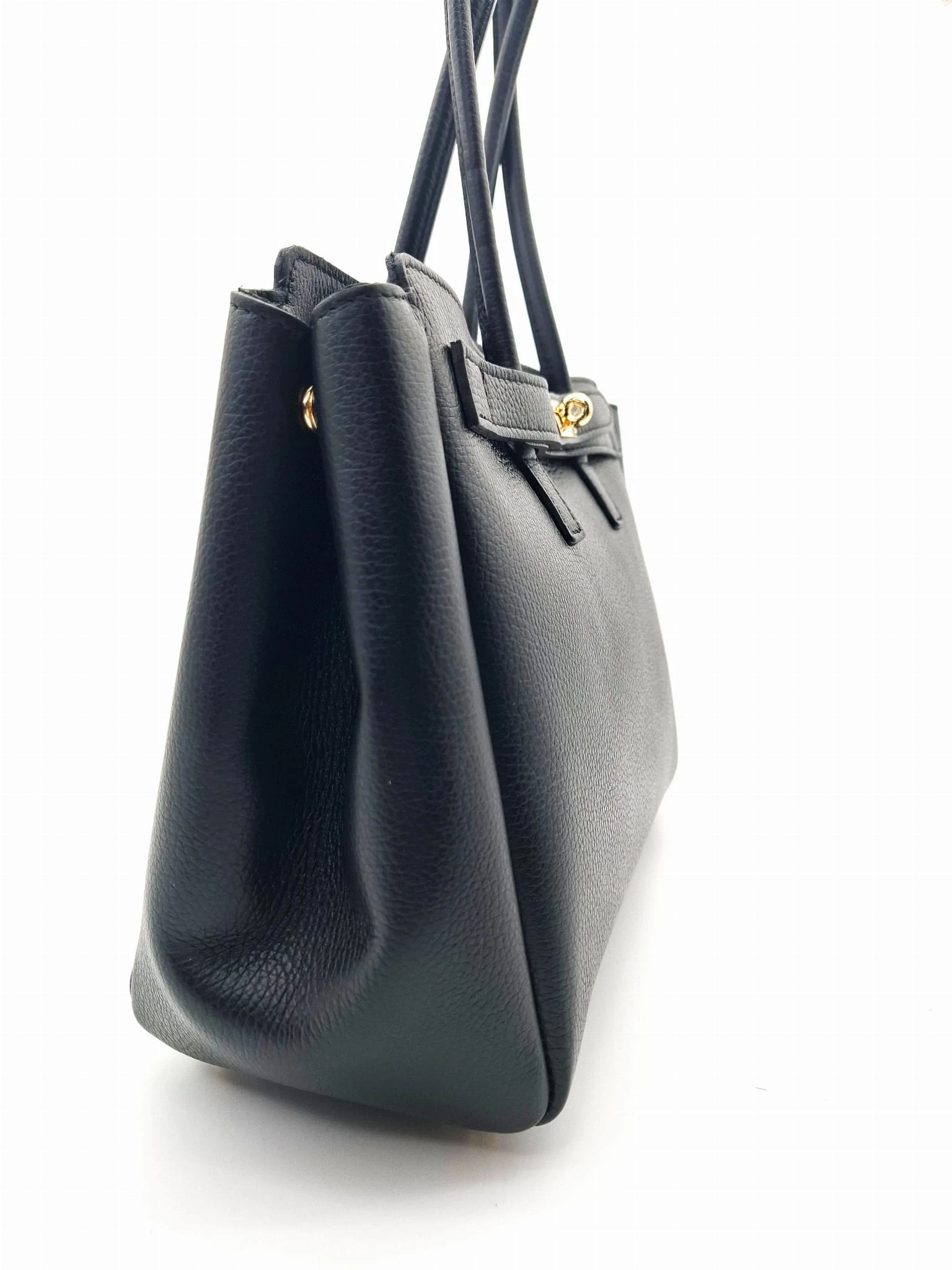 Bestseller - klasyczna czarna torebka z ozdobnym zapięciem oraz regulacją szerokości dzięki bocznym zatrzaskom.
