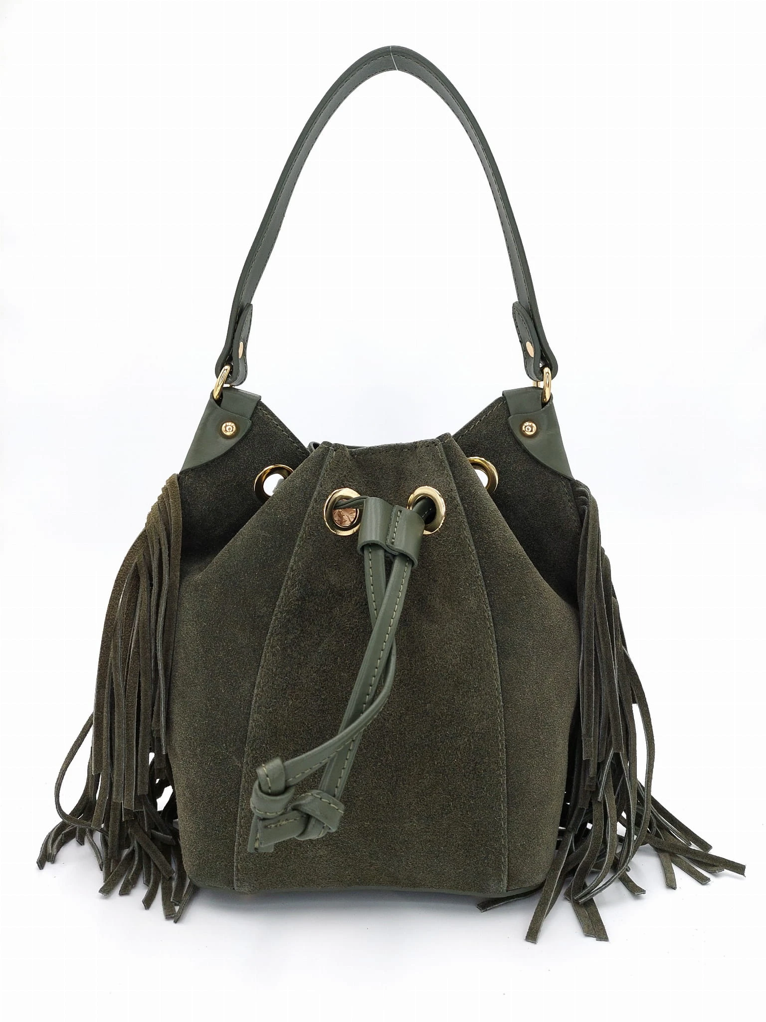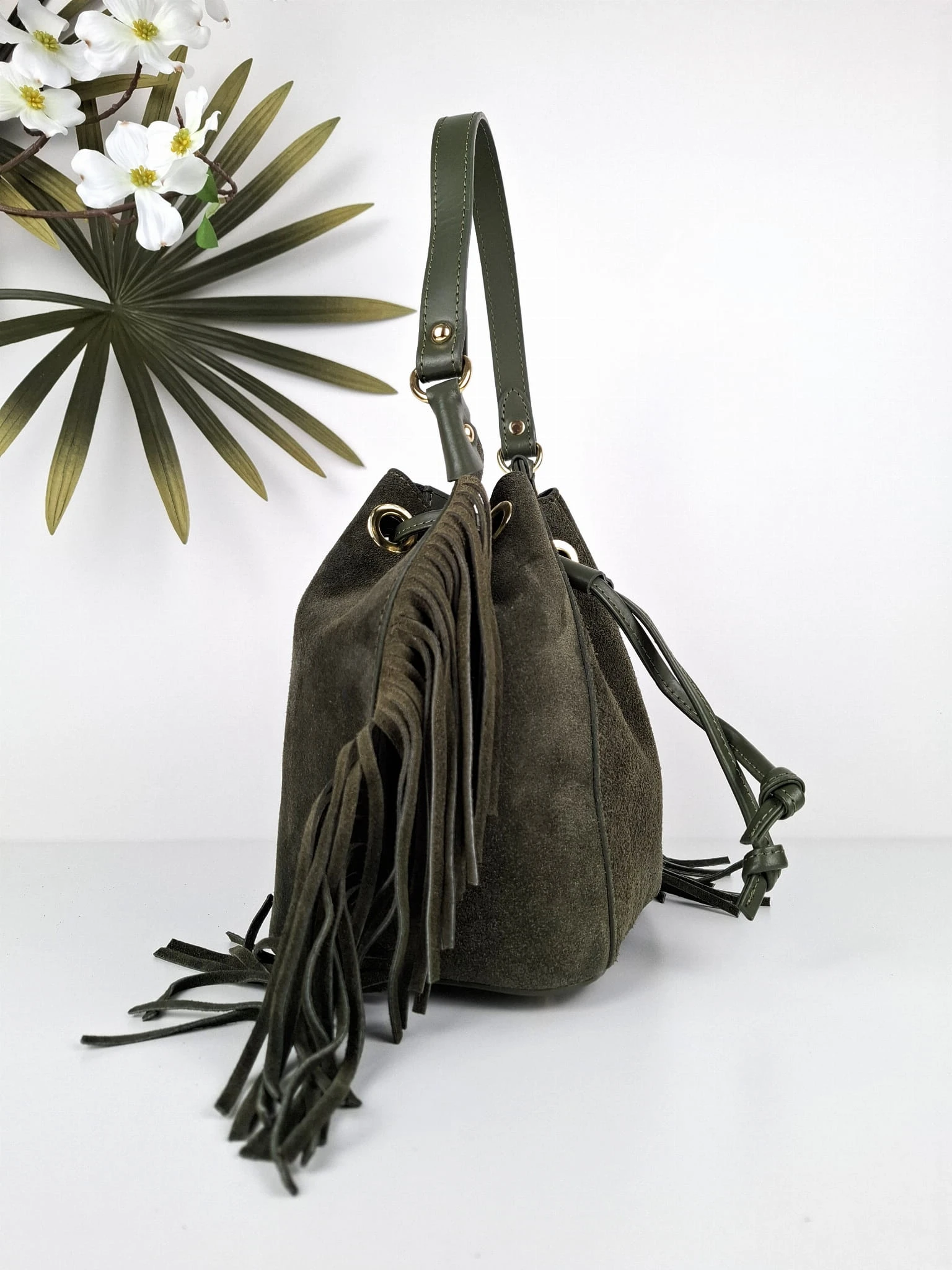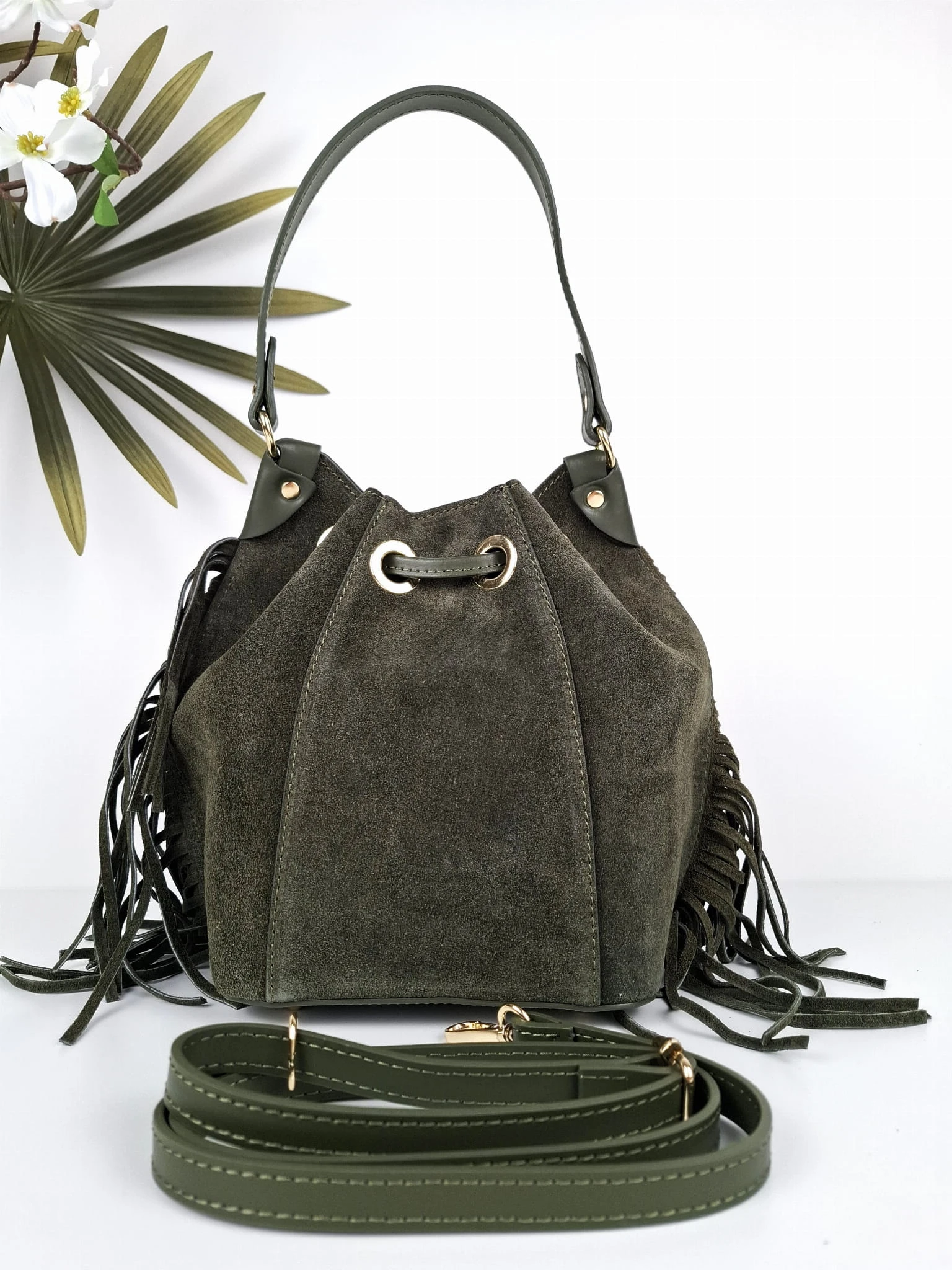 Vera Pelle torebka zielona worek zamszowy skórzany frędzle boho Lilly