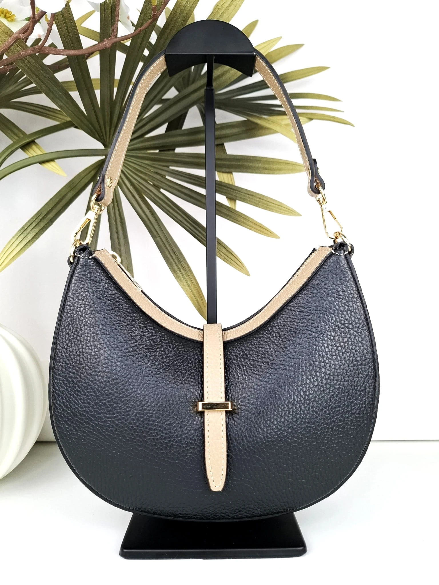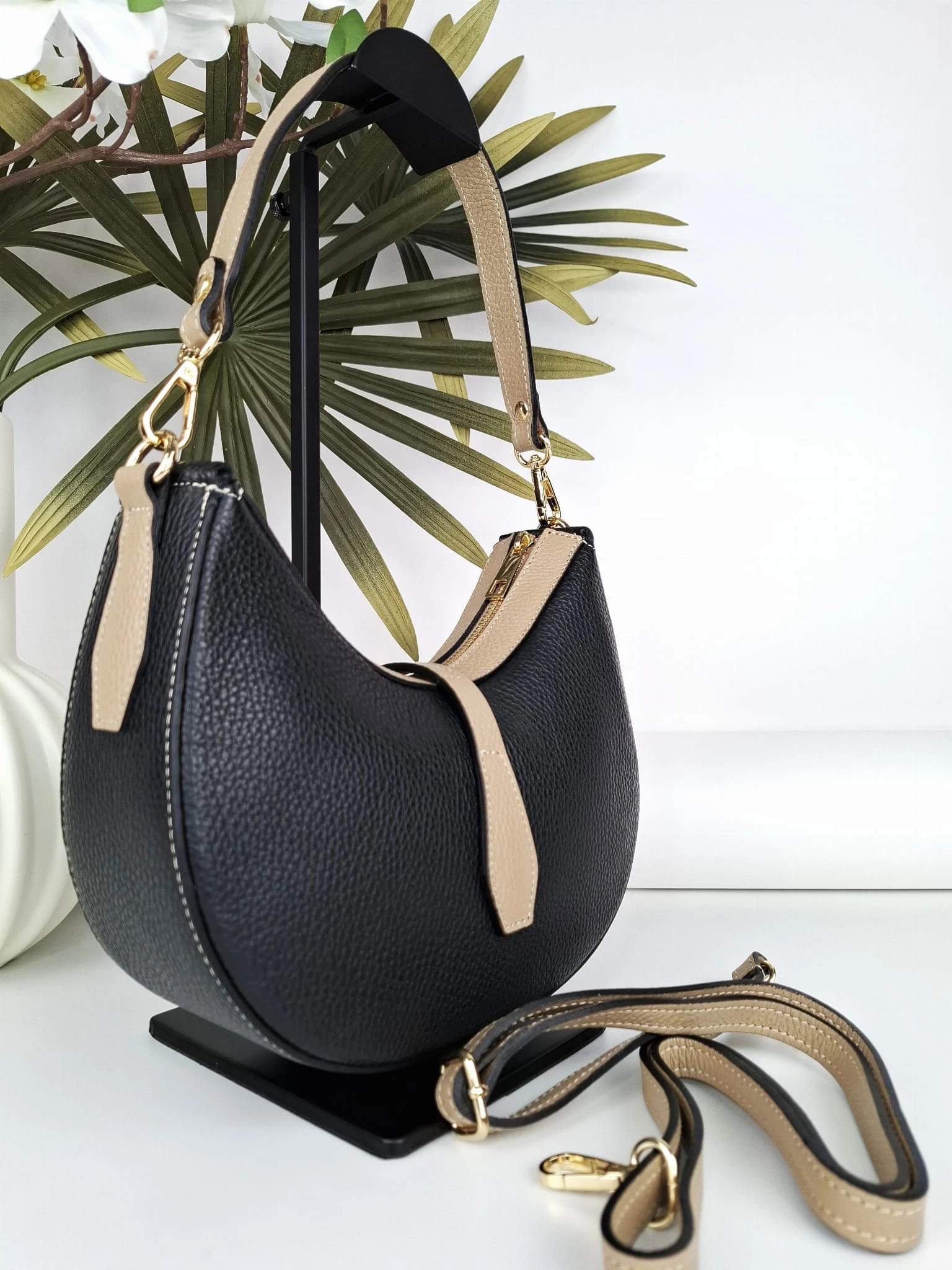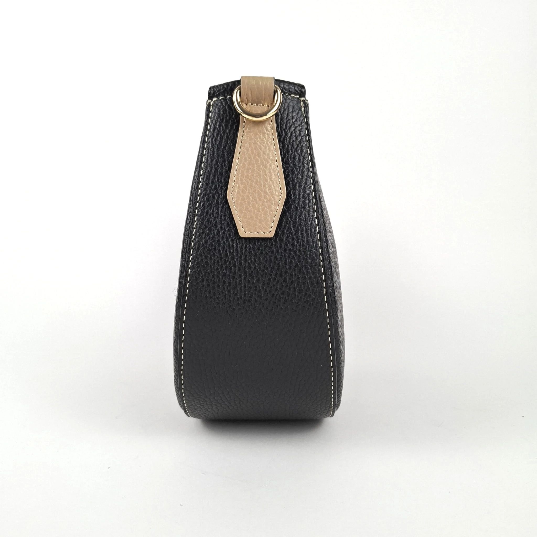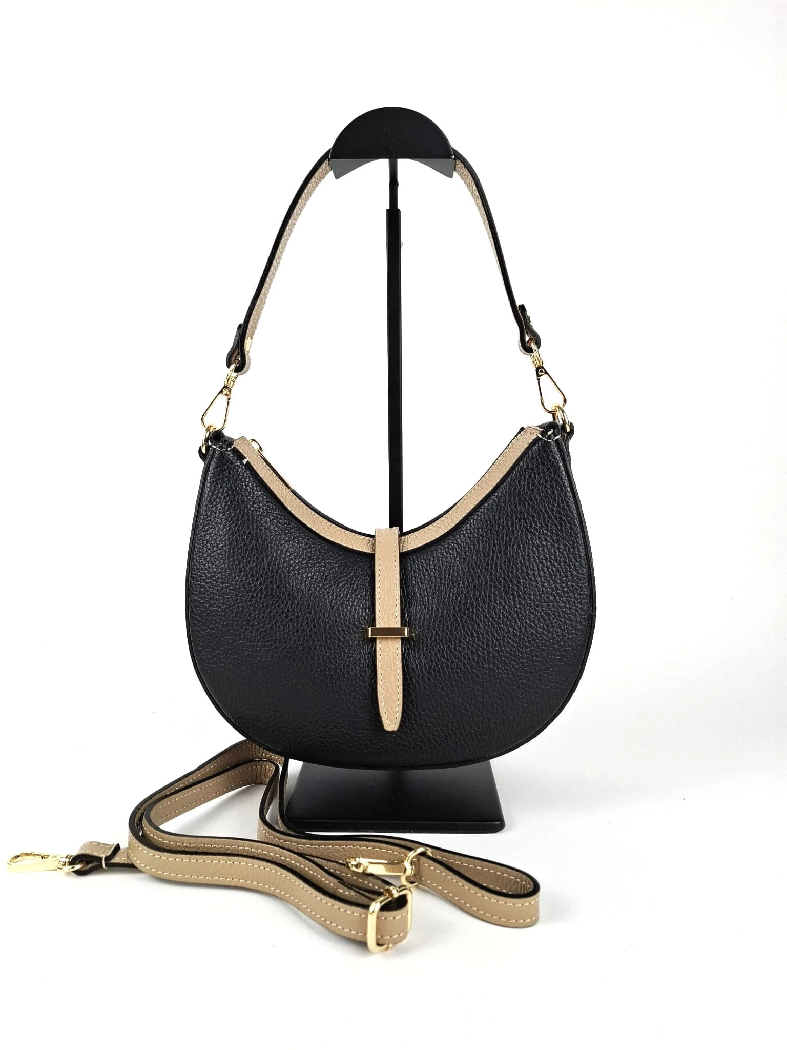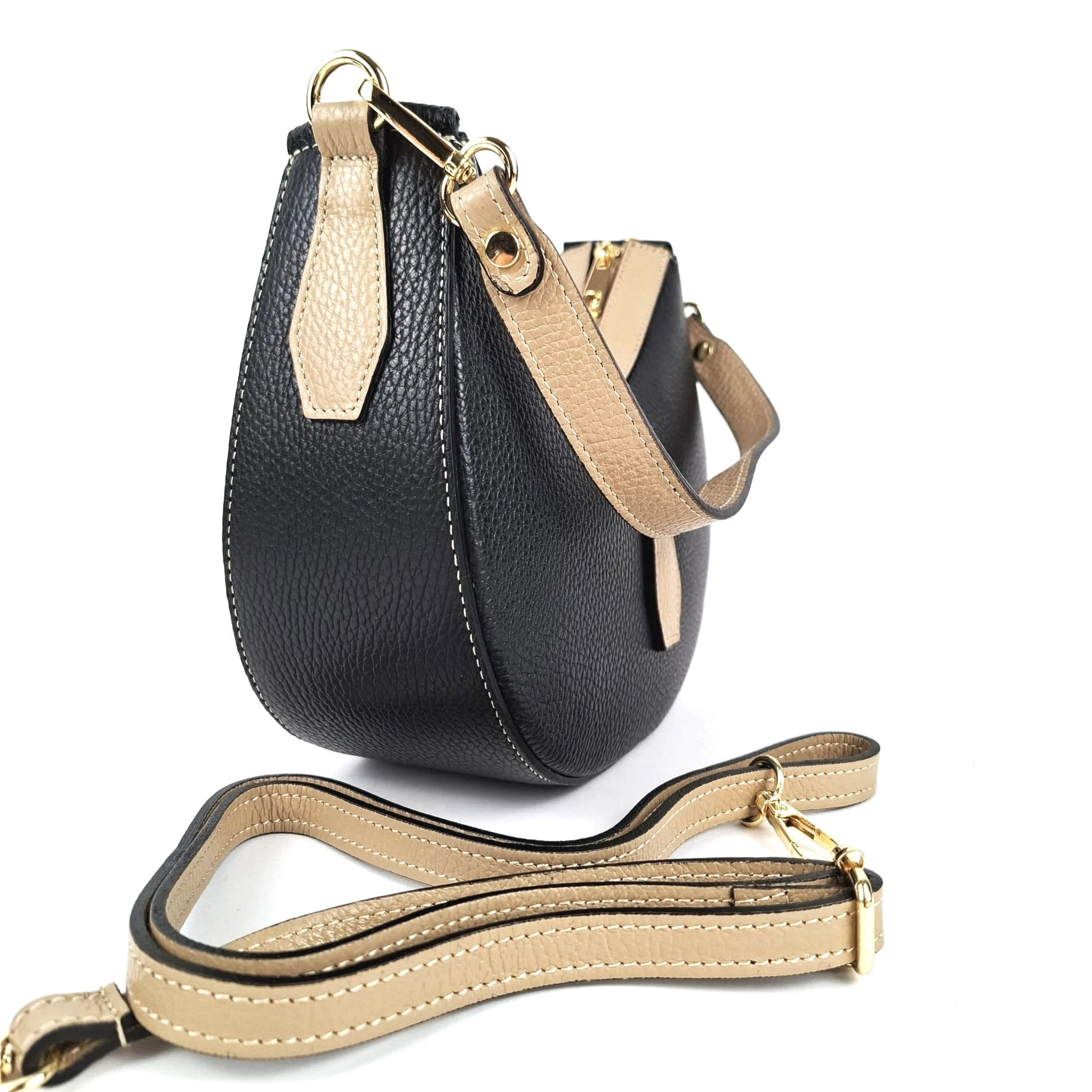 Mała włoska czarno-beżowa torebka skórzana na dwóch paskach - model Emma